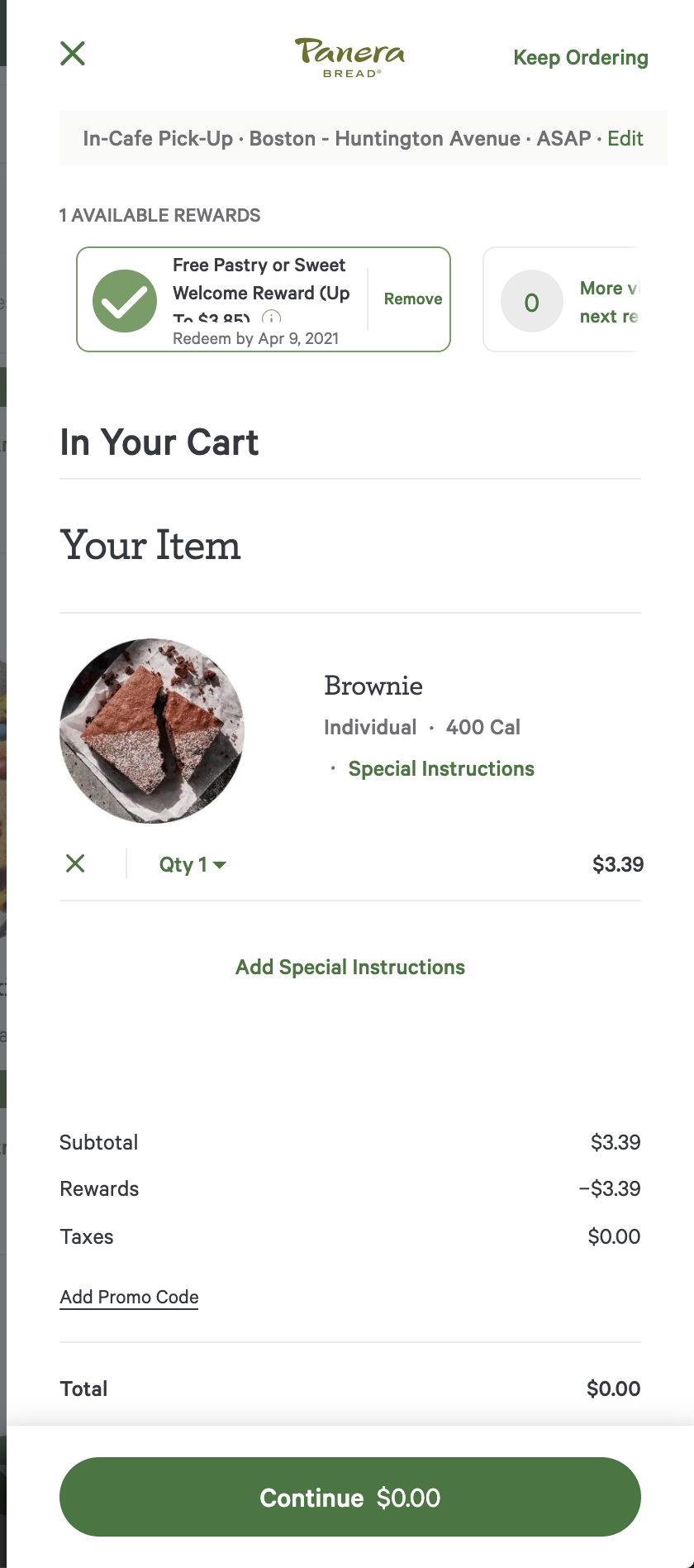 While unlikely, this type of scenario is entirely technically possible and requires surprisingly little automation - we estimate that a developer would likely have to research and ultimately deploy somewhere on the order of 100 lines of code in order to generate infinite brownies. As a proof of concept, we attempted a pickup of three pastries - first, we picked up a single pastry with a fresh throwaway MyPanera rewards account.